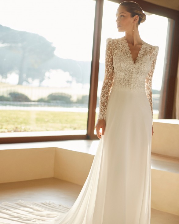 Eliminar de lista Lista de deseos Quick view Aire Boho - ZOWI Vestido de novia, de corte recto. Confeccionado en tul con cuerpo encaje y pedrería. Escote pico, manga larga y espalda abotonada. Con falda...