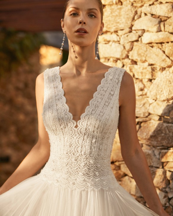 Eliminar de lista Lista de deseos Quick view Aire Boho - ZAZURK Vestido de novia, de corte evasé. Confeccionado en georgette con cuerpo encaje y pedrería. Escote profundo con tirantes de pedrería y espalda...