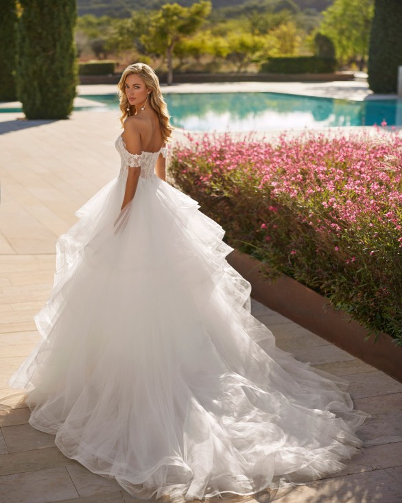 Eliminar de lista Lista de deseos Quick view Adriana Alier - SINDY Vestido de novia largo de volumen en tul con cuerpo de encaje, pedrería, escote profundo, tirantes de flores y espalda cuadrada.