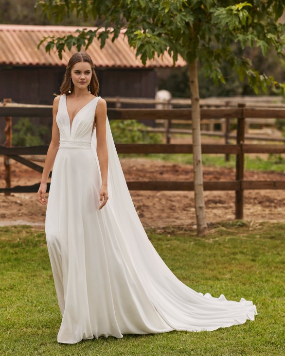 Eliminar de lista Lista de deseos Quick view Alma Novia - NASARA Vestido de novia largo, de dos piezas y corte recto. Confeccionado en crepé con adorno de encaje, escote pico, tirantes y espalda en V con capa.