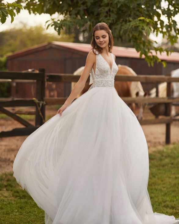 Eliminar de lista Lista de deseos Quick view Aire Royale - KIAN Vestido de novia, largo línea A. Elaborado con tul y cuerpo de encaje. Escote profundo y tirantes con detalles florales.