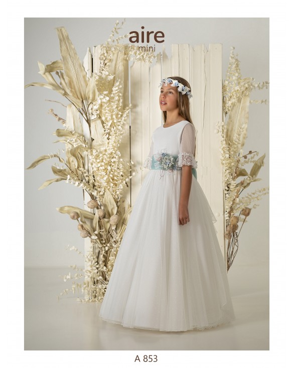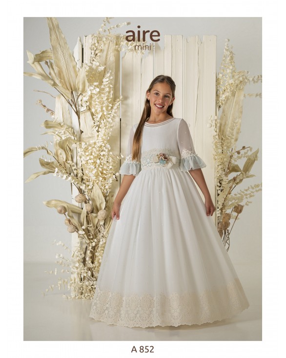 Eliminar de lista Lista de deseos Quick view Aire Mini - A852 Vestido de comunión largo, de estilo romántico. Confeccionado en tul bordado con vainica y adornos florales. Presenta escote barco, manga...