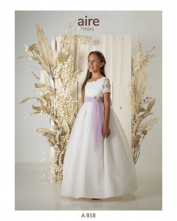 Eliminar de lista Lista de deseos Quick view Aire Mini - A858 Vestido de comunión largo, de estilo romántico. Confeccionado en organza con fajín y flor de adorno. Presenta escote con ondas, manga tul bordado...