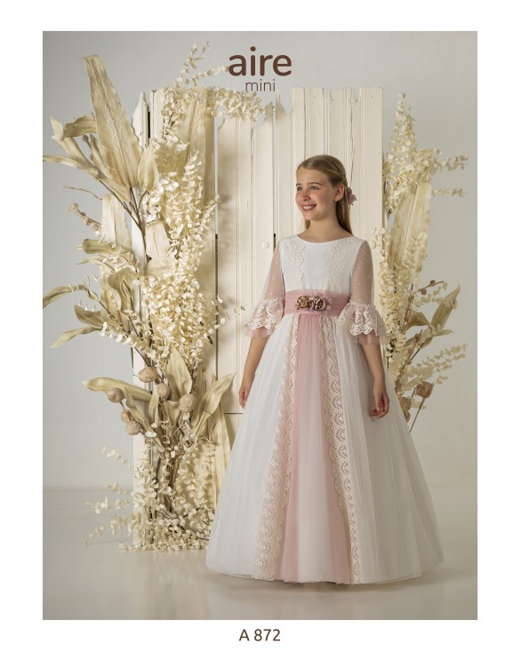 Eliminar de lista Lista de deseos Quick view Aire Mini - A872 Vestido de comunión largo, de estilo romántico. Confeccionado en tul bordado con fajín y flor de adorno. Presenta escote barco, manga tul bordado...