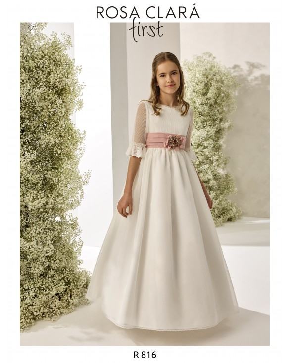 Eliminar de lista Lista de deseos Quick view Rosa Clará First - R805 Vestido de comunión largo, de estilo romántico. Confeccionado en tul con fajín y flor de adorno. Presenta escote barco, manga francesa y espalda...