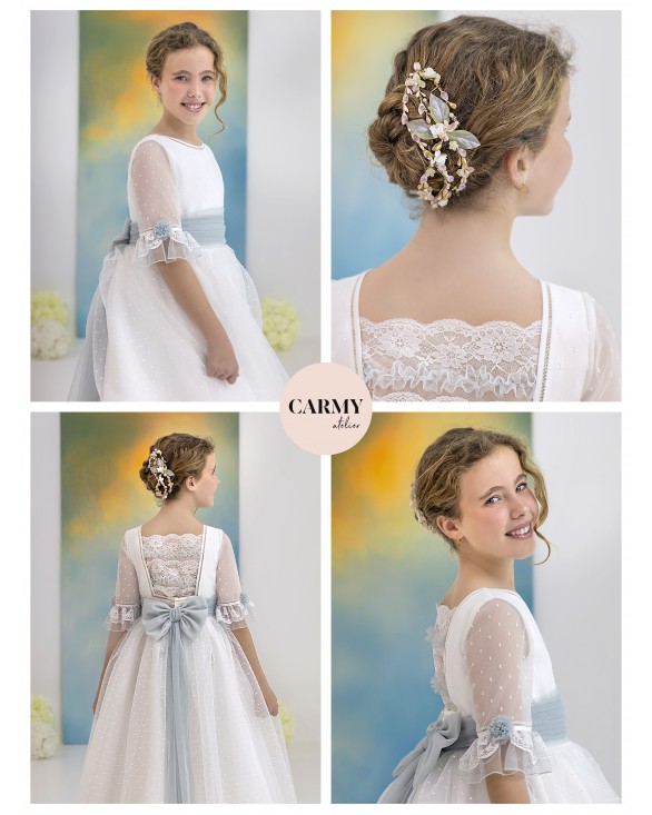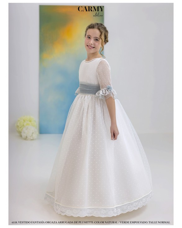 Vestido de comunión elaborado en delicada organza con detalles de plumetti, ideal para la ocasión. Tiene un escote delantero redondo con vainica y una espalda transparente adornada con puntillas. La falda, rematada en puntilla en el bajo, lleva un tul verde empolvado debajo, aportando un toque de color. Las mangas largas hasta el codo terminan en un volante de puntilla, y el cinturón de tul verde empolvado con lazo en la espalda completa un conjunto elegante y romántico.