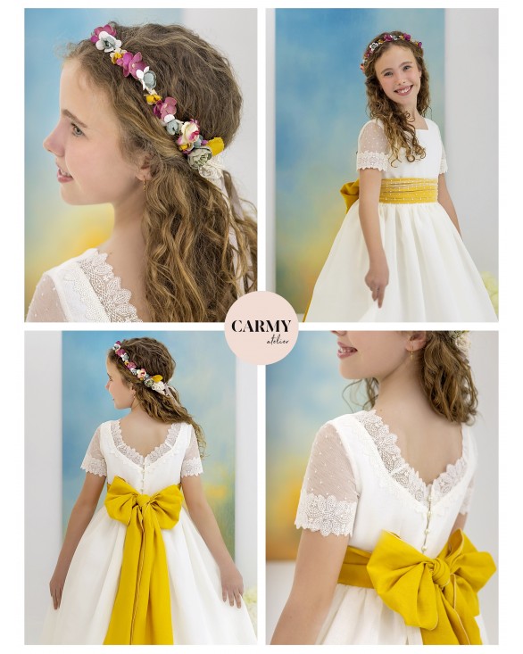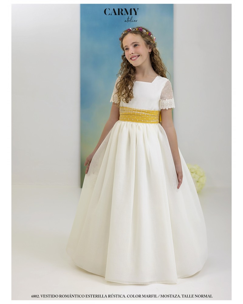 Vestido de comunión elaborado en esterilla rústica de color marfil, que combina sencillez y elegancia. El cuerpo presenta un escote cuadrado en el parte delantera y una espalda redondeada rematada con puntilla delicada. Incluye un cinturón en tono mostaza, realzado por un tul de bodoques decorativo y una lazada en la parte trasera, aportando un toque romántico y tradicional perfecto para la ocasión.