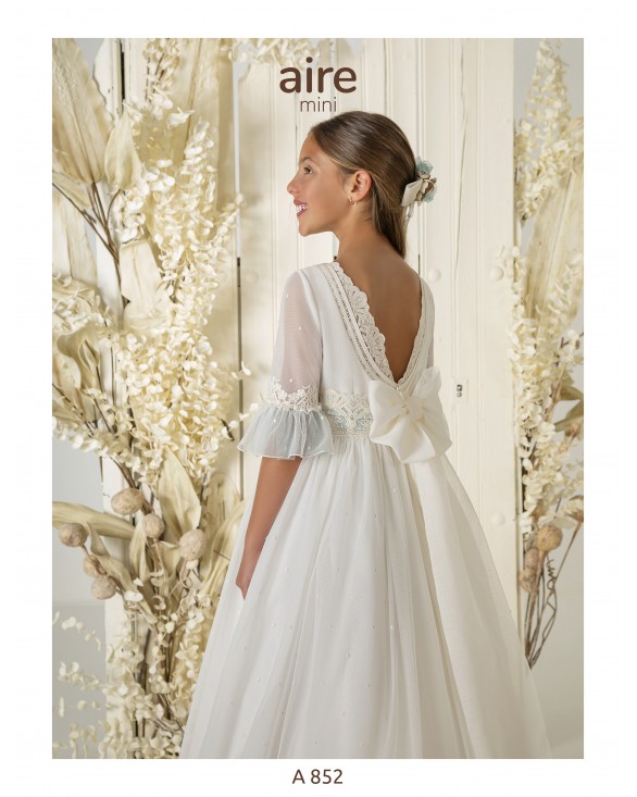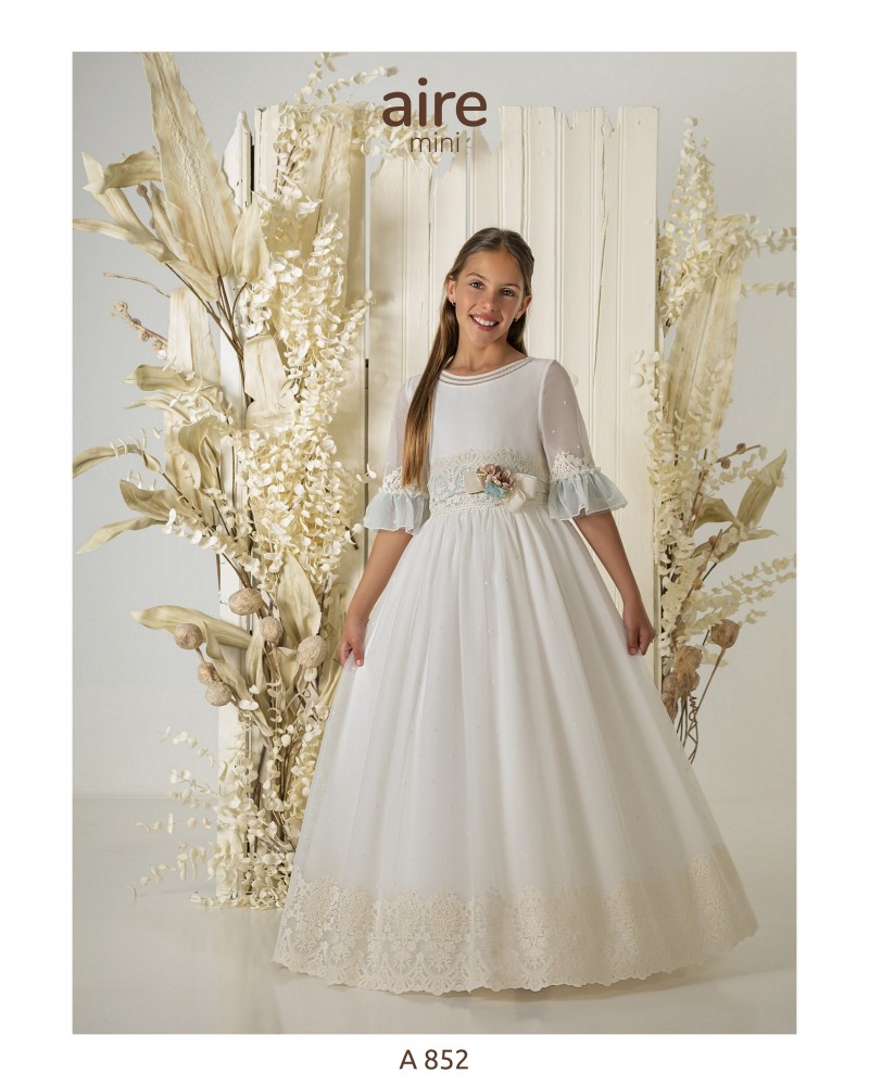 Vestido de comunión largo, de estilo romántico. Confeccionado en tul bordado con vainica y adornos florales. Presenta escote barco, manga francesa y espalda en V.