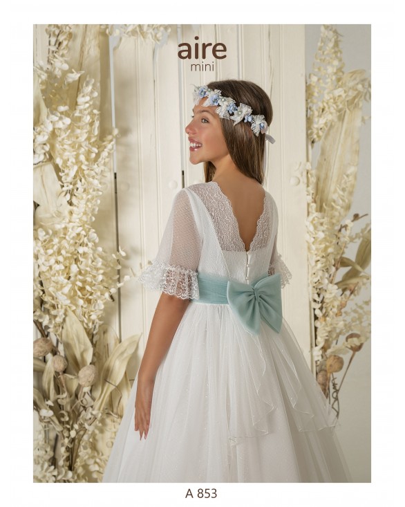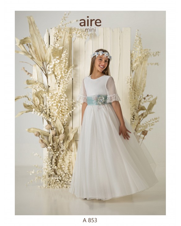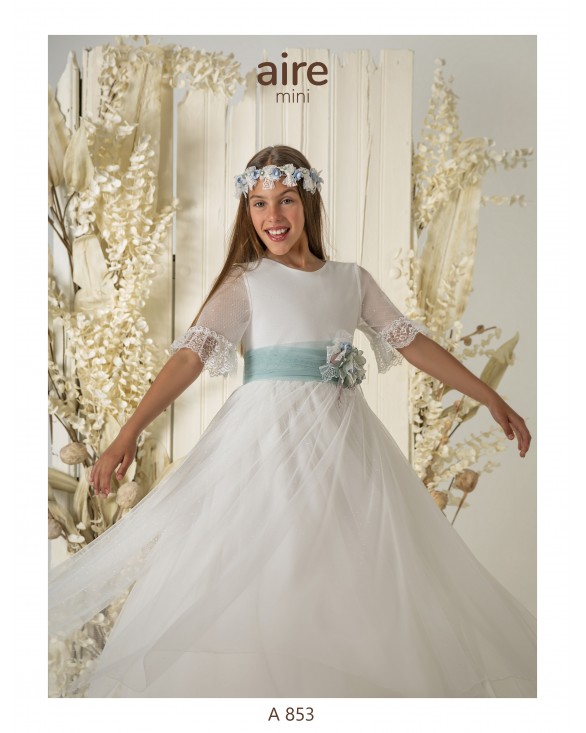Vestido de comunión largo, de estilo romántico. Confeccionado en tul topos con fajín y flor de adorno. Presenta escote redondo, manga corta y espalda en V.