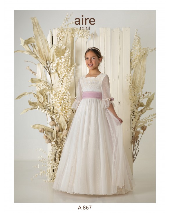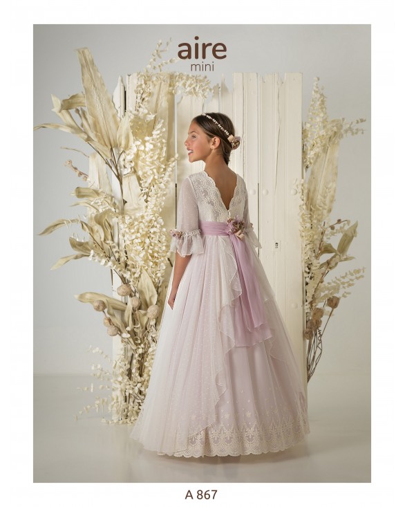 Vestido de comunión largo, de estilo romántico. Confeccionado en tul bordado con fajín y flor de adorno. Escote cuadrado, manga francesa y espalda en V.