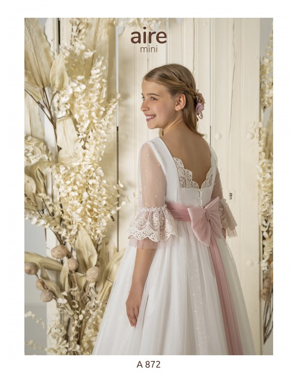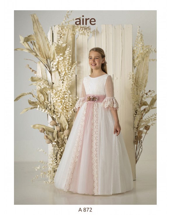Vestido de comunión largo, de estilo romántico. Confeccionado en tul bordado con fajín y flor de adorno. Presenta escote barco, manga tul bordado y espalda escotada.