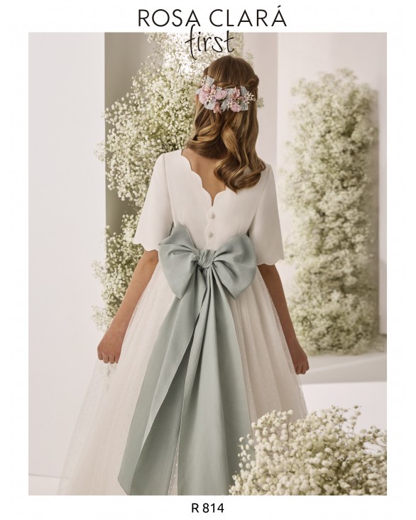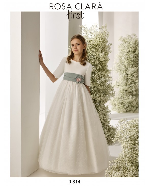 Vestido de comunión largo, de estilo romántico. Confeccionado en crepé y tul bodoques con fajín y flor de adorno. Presenta escote con ondas, manga francesa y espalda en V con ondas.