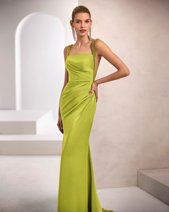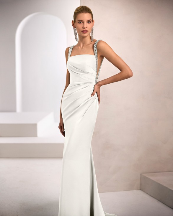 Vestido de fiesta largo. Confeccionado en crepé satén. Tirantes de pedrería. Disponible en blanco.