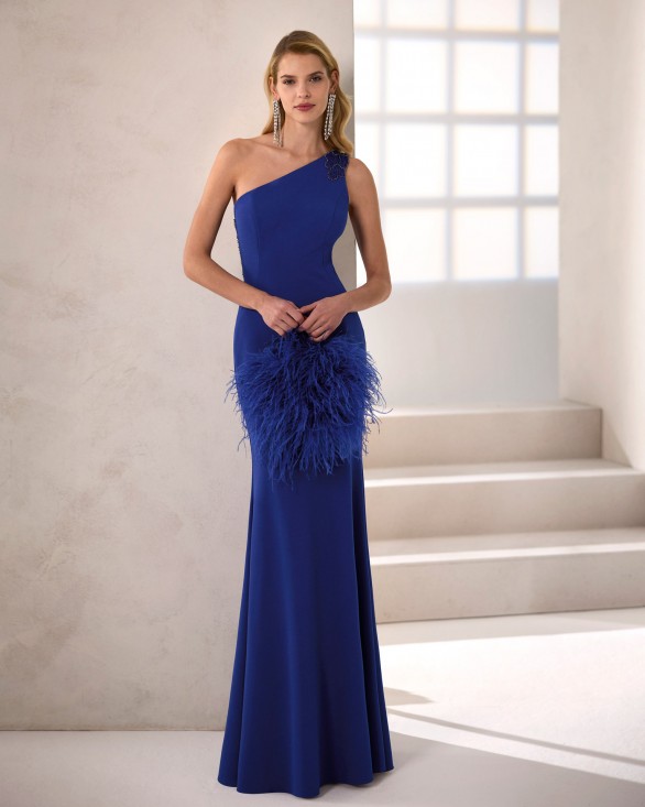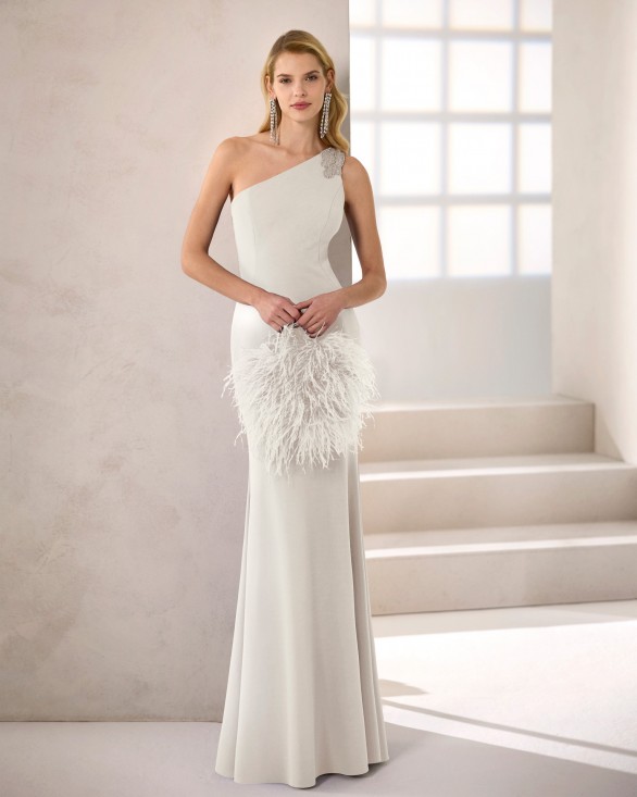 Vestido de fiesta largo. Confeccionado en crepé satén. Escote asimétrico, tirantes y espalda de pedrería. Disponible en blanco.
