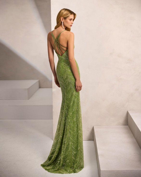 Vestido de fiesta largo. Confeccionado en pedrería. Escote profundo, tirantes y espalda escotada. Incluye chal.