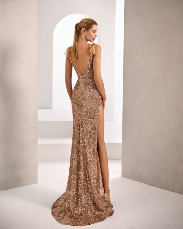 Vestido de fiesta largo. Confeccionado en pedrería. Escote pico, tirantes y espalda escotada. Falda con abertura lateral. Incluye chal.