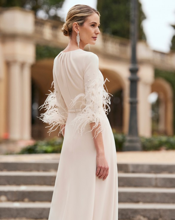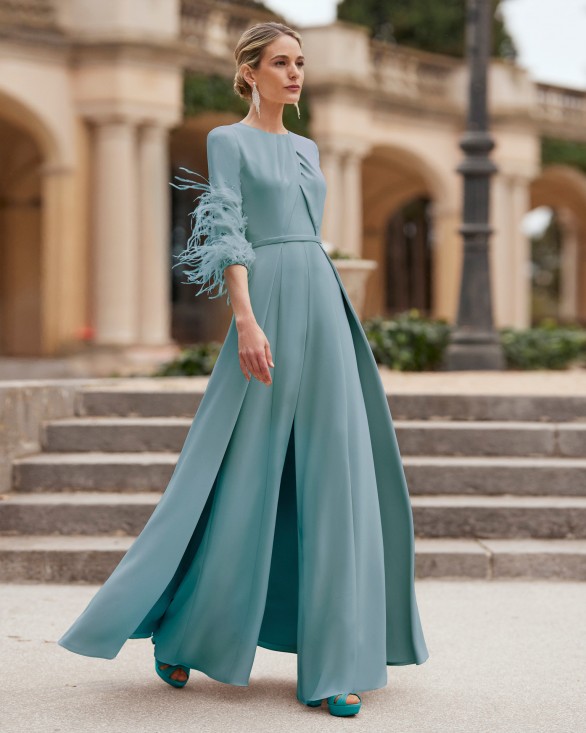 Vestido Pantalón de cóctel y estilo elegante. Confeccionado en triacetato. Con escote redondo y manga francesa con plumas.Look Couture Club.