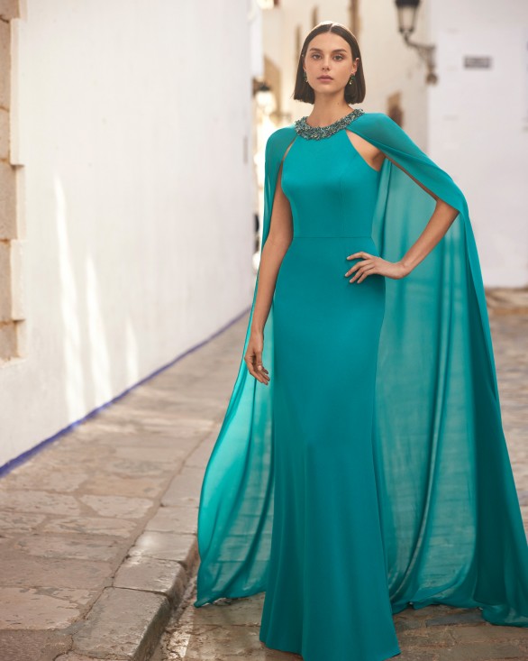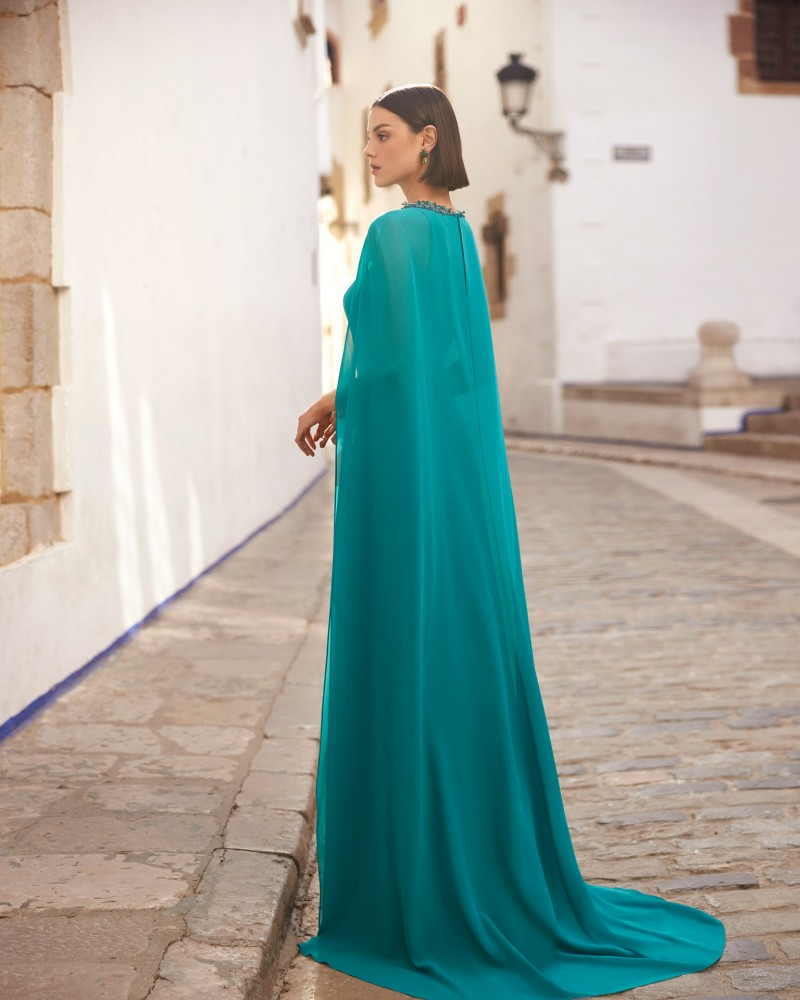 Vestido de fiesta largo y estilo fluido. Confeccionado en crepé. Con escote redondo, espalda cerrada, conjuntando con Capa. Look Aire Barcelona para fiestas y eventos.