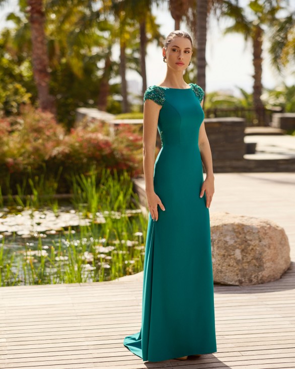 Vestido de fiesta largo, crepé. Escote barco, manga corta. Espalda con abertura con detalles de pedrería, chal incluido.