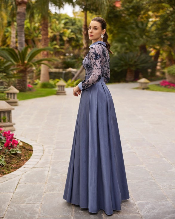 Vestido de fiesta largo,tafetán,cuerpo pedrería. Cuello camisero,manga larga. Espalda con obertura redonda,cinturón incluido.