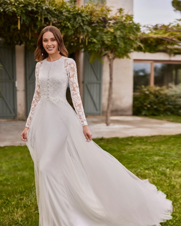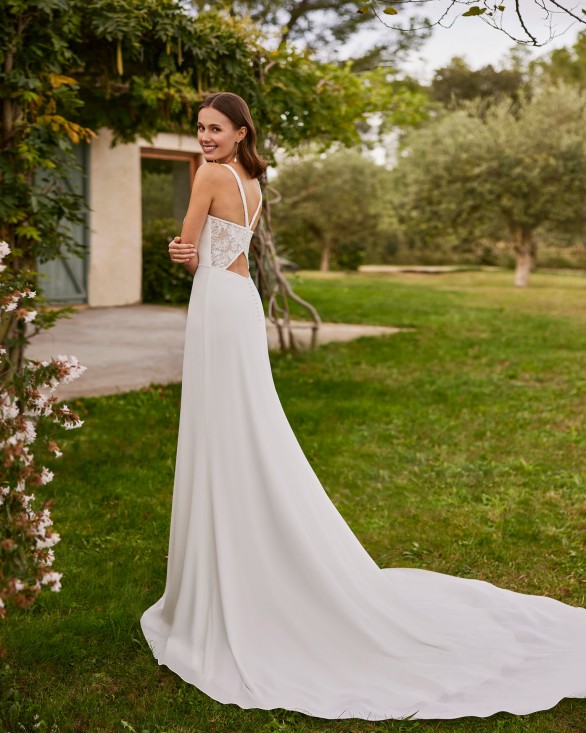 Vestido de novia largo, de dos piezas y corte recto. Confeccionado en crepé con escote halter, tirantes, espalda de encaje y chaqueta de encaje.