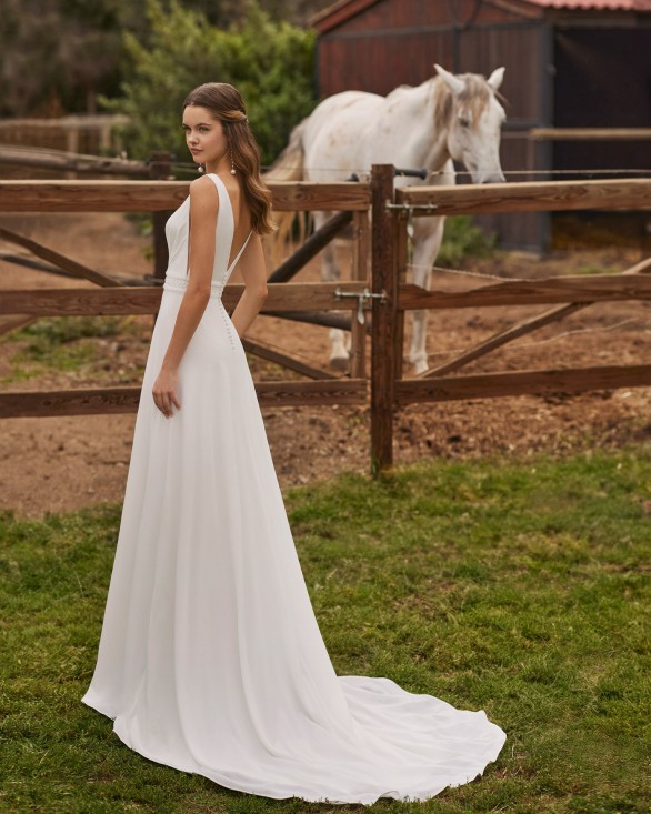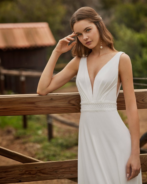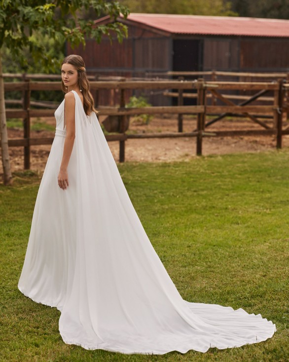 Vestido de novia largo, de dos piezas y corte recto. Confeccionado en crepé con adorno de encaje, escote pico, tirantes y espalda en V con capa.