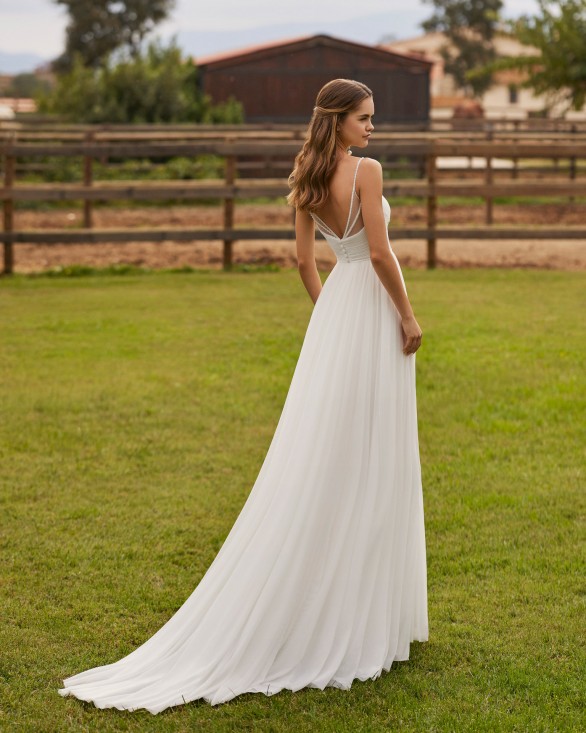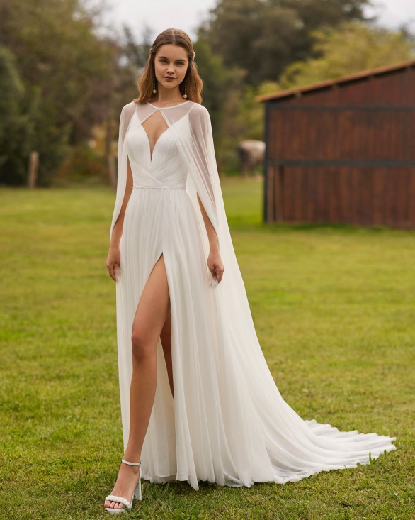 Vestido de novia largo, de dos piezas y corte recto. Confeccionado en muselina de seda con escote pico, tirantes y espalda escotada con capa y falda con abertura lateral.