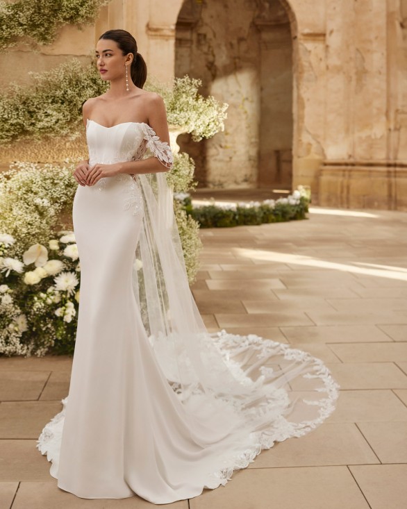 Vestido de novia, de corte sirena. Confeccionado en crepé bielástico con escote palabra de honor. Tirantes extraíbles, espalda escotada y capa incluida.