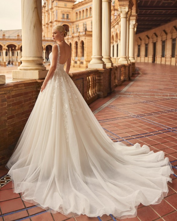 Vestido de novia, largo línea A. Elaborado con tul, cuerpo de encaje, escote cuadrado, tirantes y espalda escotada.