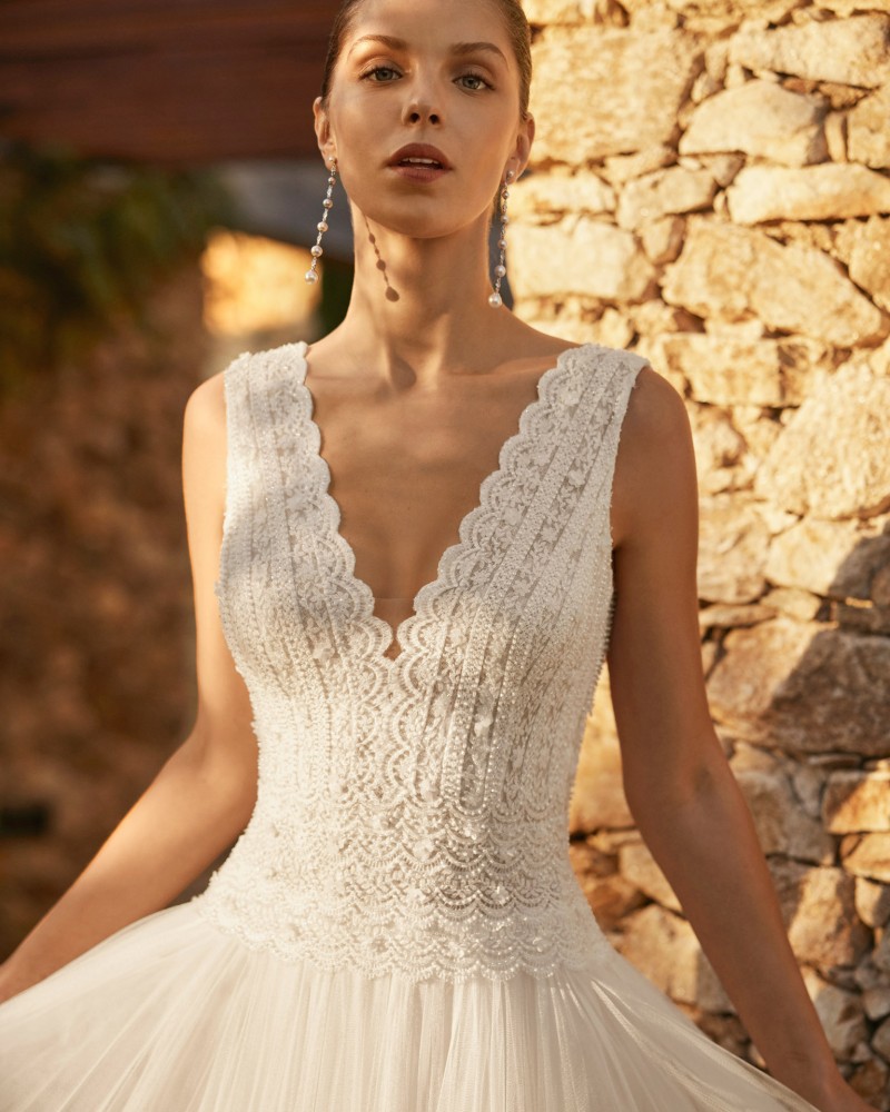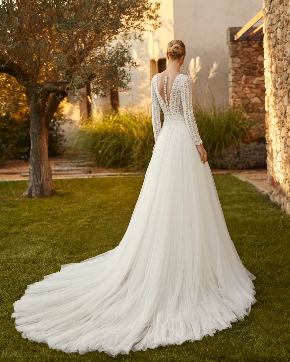Vestido de novia, de corte recto. Confeccionado en tul con cuerpo encaje y pedrería. Escote pico, manga larga y espalda abotonada. Con falda abertura en el lateral.