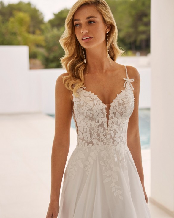 Vestido de novia largo dos piezas evasé en georgette con cuerpo de encaje, pedrería, escote profundo, tirantes de pedrería, espalda en V y chaqueta.