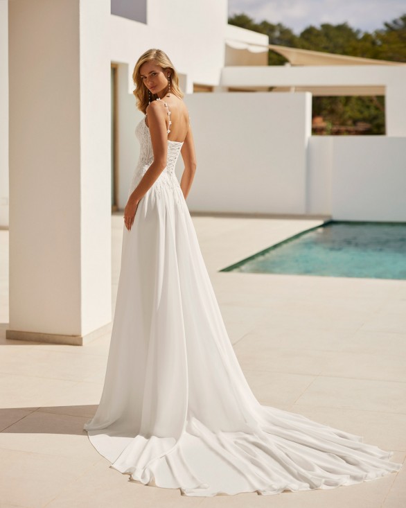 Vestido de novia largo evasé en georgette con cuerpo de encaje, pedrería, escote corazón, tirantes de flores y espalda corsé.