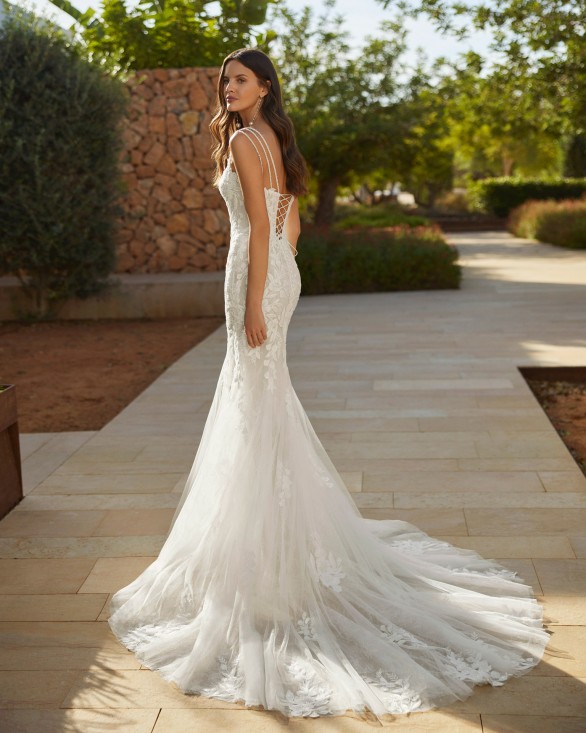 Vestido de novia largo dos piezas sirena en encaje con pedrería, escote profundo, tirantes de pedrería, espalda corsé y sobrefalda.