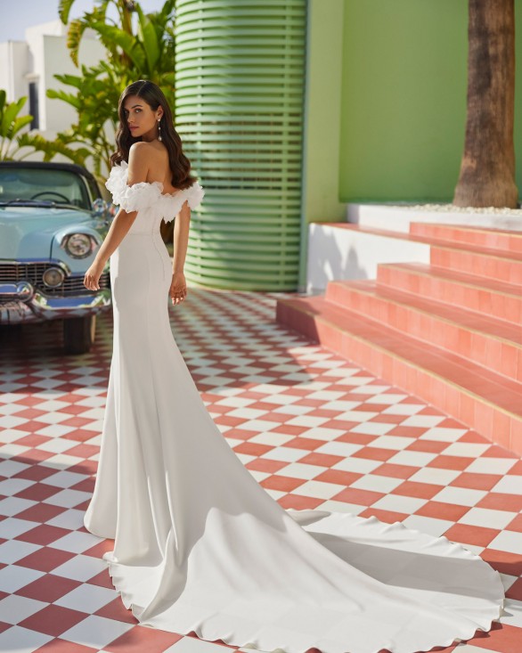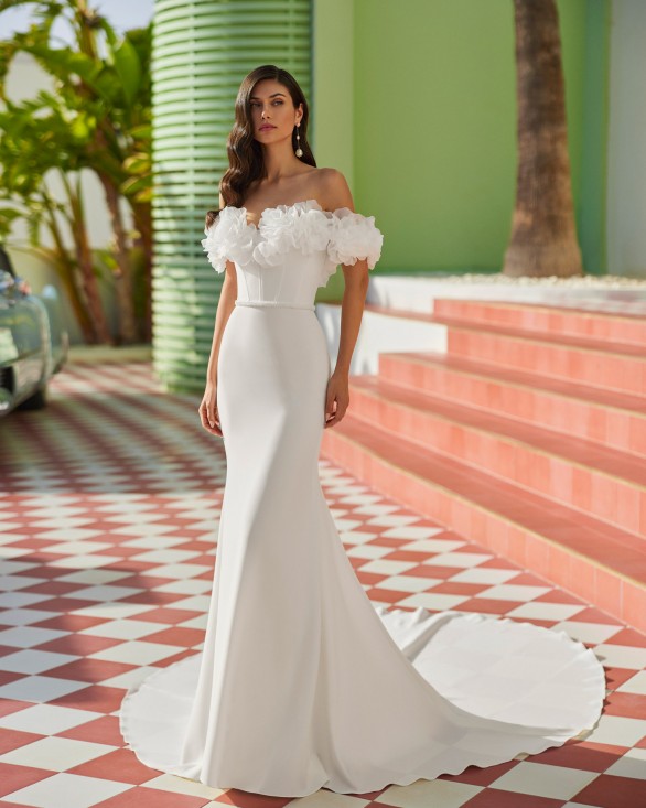 Vestido de novia largo de corte sirena. Crepé bielástico Vera, escote corazón, tirantes de flores y espalda abierta.