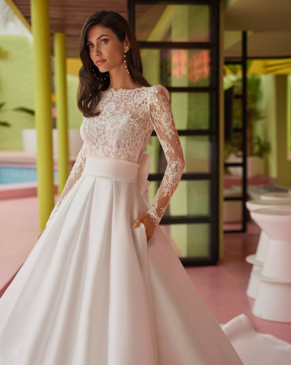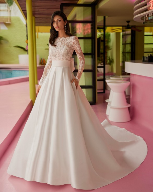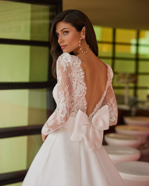 Vestido de novia largo de corte volumen. Mikado, escote barco, manga larga, espalda en V y lazo.