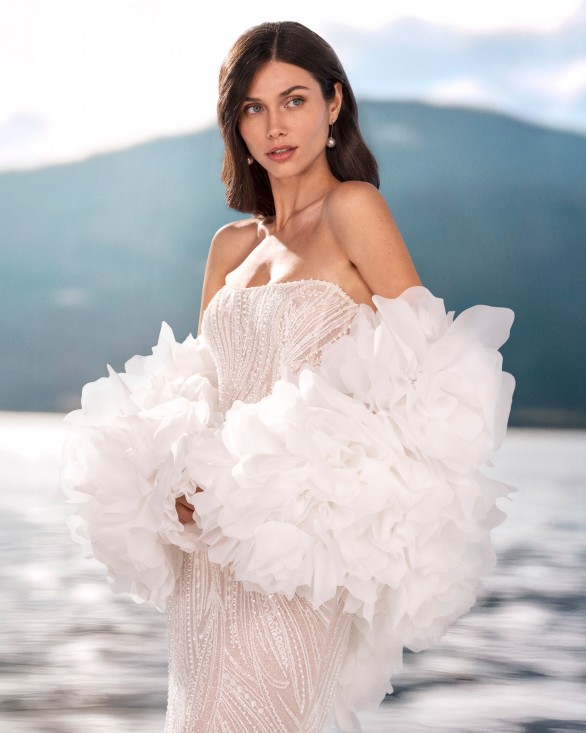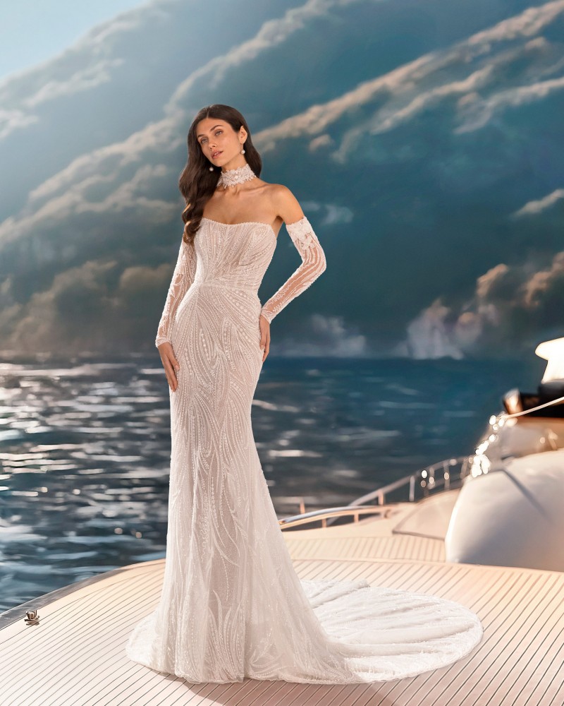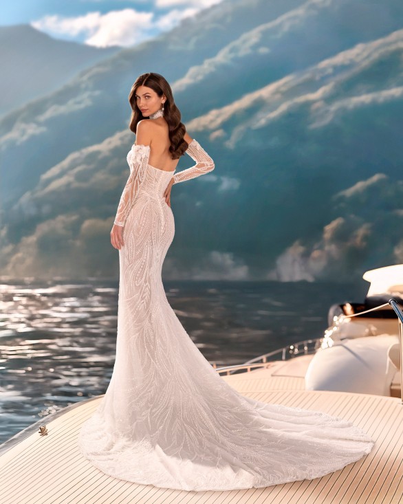 Vestido de novia, estilo sirena en pedrería, con escote palabra de honor y mangas extraíbles. Espalda escotada. Con choker.