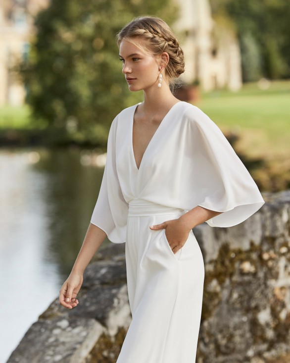 Vestido pantalón de novia de crespón. Escote en V ablusado, manga caída tres cuartos y espalda escotada.